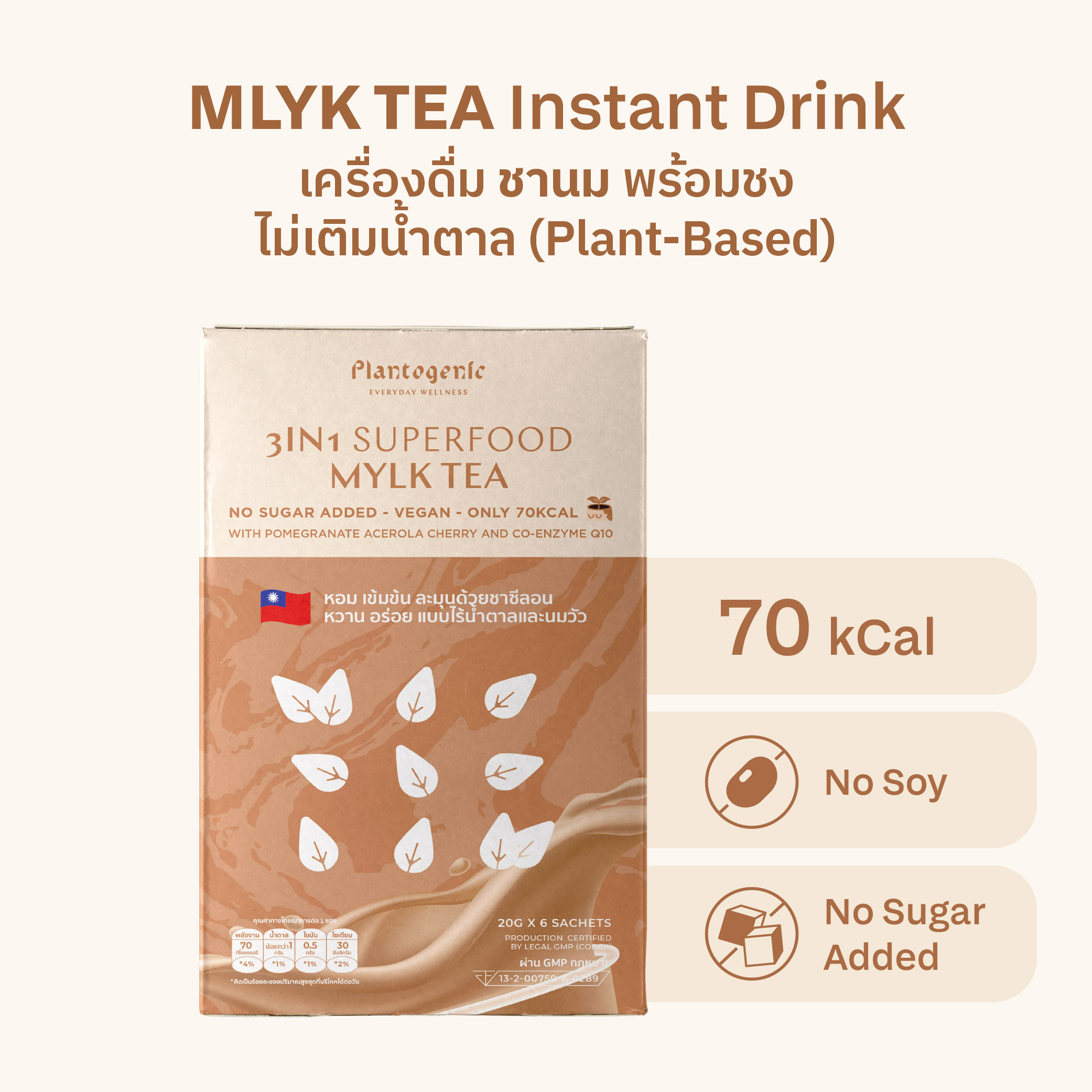 ผงชาไต้หวัน, ครีมเทียมน้ำมันมะพร้าว, ผงชา, สารสกัดอะเซโรล่าเชอร์รี, ผงบัวบก, สารสกัดทับทิม, โคเอนไซม์คิวเท็น, ไลโคปีน, หญ้าหวาน, วิตามินดี