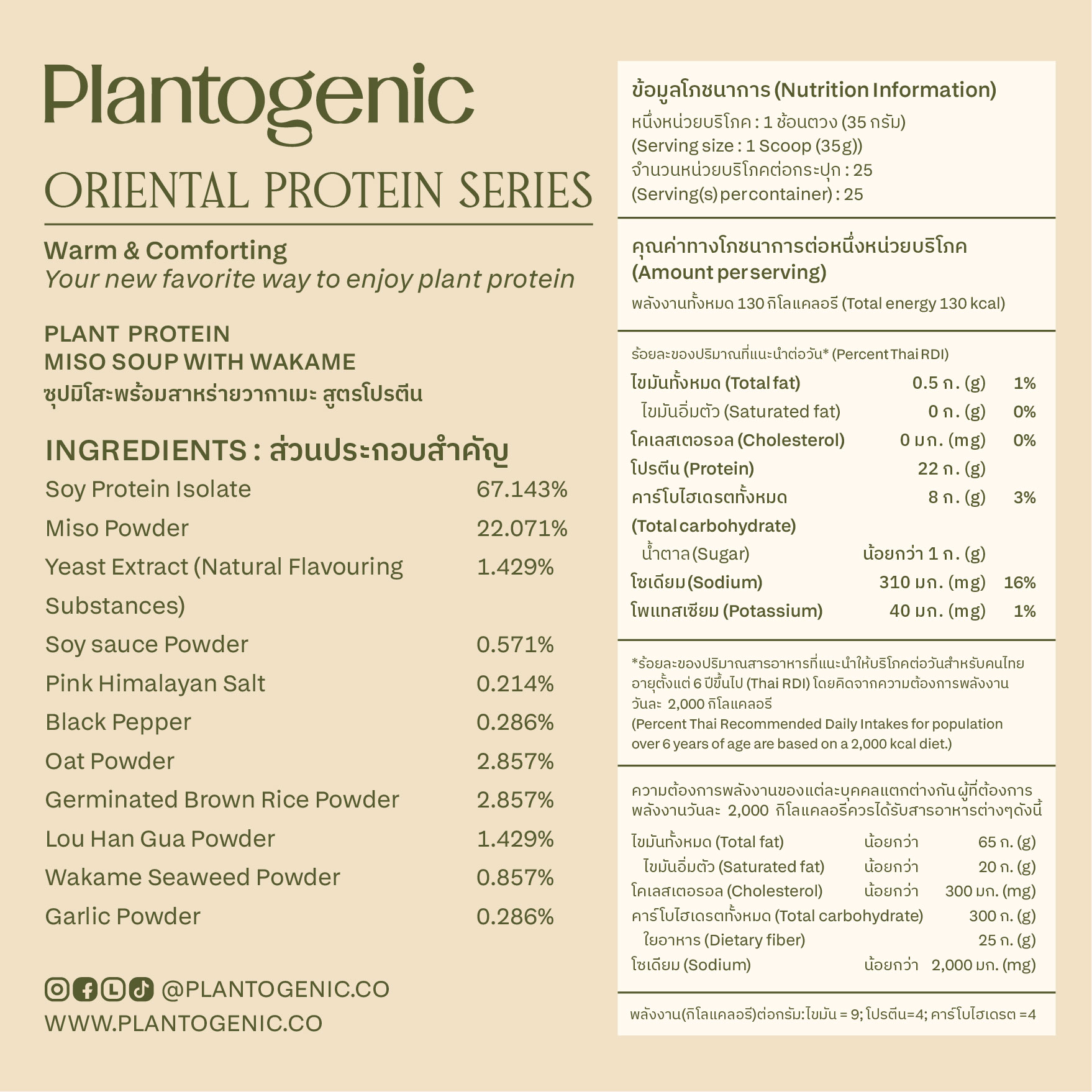 Soy Protein Isolate, Miso Powder, Yeast Extract (Natural Flavouring Substances), Soy sauce Powder, Pink Himalayan Salt, Black Pepper, Oat Powder, Germinated Brown Rice Powder, Lou Han Gua Powder, Wakame Seaweed Powder, Garlic Powder